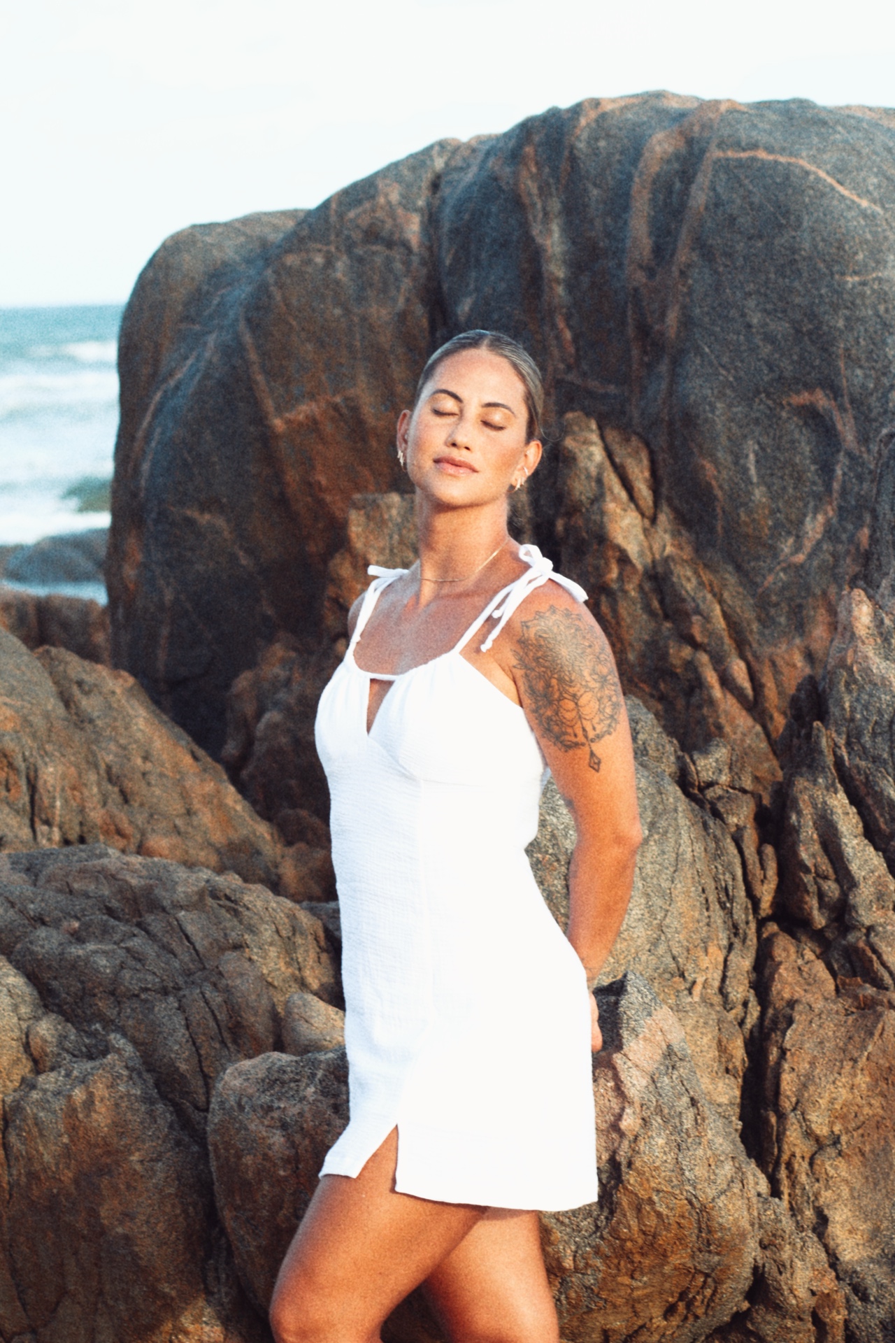 Vestido de algodão off white, tecido texturizado, com zíper invisível nas costas;